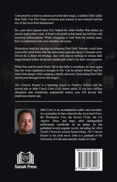 Consumed by a thirst to unlock powerful dark magic, a sadistic killer stalks Deer Falls. Can Eric Olson overcome past trauma to save himself and the rest of the town from destruction? Six years have passed since Eric helped his older brother Ron defeat an ancient malevolent witch. A brush with death in that battle has left him with recurring hallucinations. While struggling to heal from his mental scars, Eric is confronted with a new deadlier adversary. Mysterious ritualistic slayings are plaguing Deer Falls. Nobody is safe from a powerful serial killer who has descended upon the sleepy Colorado town. Driven by a thirst for revenge, they will stop at nothing to release dark magic housed within an ancient amulet and wield it for their own purposes. When Eric and his mom Emily fall in this killer's crosshairs, he must again face his worst nightmares brought to life. Can he protect himself and his mom from danger while stopping a deadly adversary from ruling Deer Falls and beyond through terror and magic? The Crimson Reaper is a haunting sequel to Pandora Reborn and the newest entry in John Coon's Deer Falls horror series. If you love chilling characters and relentlessly suspenseful stories, you will devour this small-town horror tale.