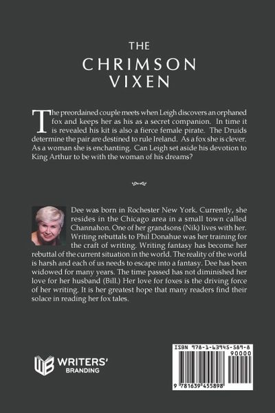 The preordained couple meets when Leigh discovers an orphaned fox and keeps her as his as a secret companion. In time it is revealed his kit is also a fierce female pirate. The Druids determine the pair are destined to rule Ireland. As a fox she is clever. As a woman she is enchanting. Can Leigh set aside his devotion to King Arthur to be with the woman of his dreams? Dee was born in Rochester New York. Currently, she resides in the Chicago area in a small town called Channahon. One of her grandsons (Nik) lives with her. Writing rebuttals to Phil Donahue was her training for the craft of writing. Writing fantasy has become her rebuttal of the current situation in the world. The reality of the world is harsh and each of us needs to escape into a fantasy. Dee has been widowed for many years. The time passed has not diminished her love for her husband (Bill.) Her love for foxes is the driving force of her writing. It is her greatest hope that many readers find their solace in reading her fox tales.
