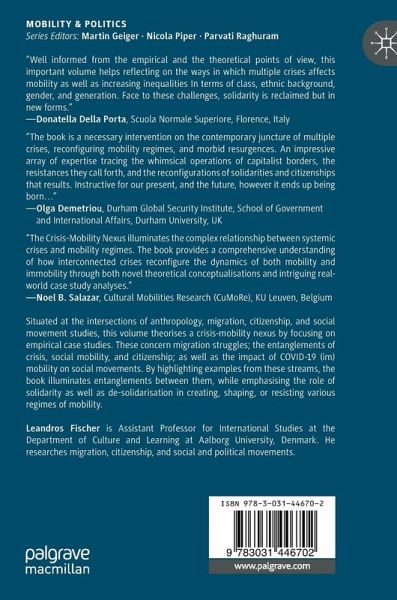 Chapter 1 - Regimes of mobility in times of accelerated crisis, Leandros Fischer.- Chapter 2 - Deportable mobilities: The many lives of the European deportation regime, Martin Bak Jørgensen.- Chapter 3 - Rethinking mobility regimes at the local scale: Possibilities and limitations, Martin Bak Jørgensen & Leandros Fischer.- Chapter 4 - Dubai and Cyprus as geographies of social mobility between Europe and the Middle East, Jaafar Alloul & Leandros Fischer.- Chapter 5 - Between solidarity and de-solidarisation: COVID-19 as a crisis of mobility, Leandros Fischer.- Chapter 6 - Essential workers without essential rights: COVID-19, migrant workers, and trade unions, Mark Bergfeld & Martin Bak Jørgensen.- Chapter 7 - New crises, new mobilities, and the promise of solidarity, Leandros Fischer.