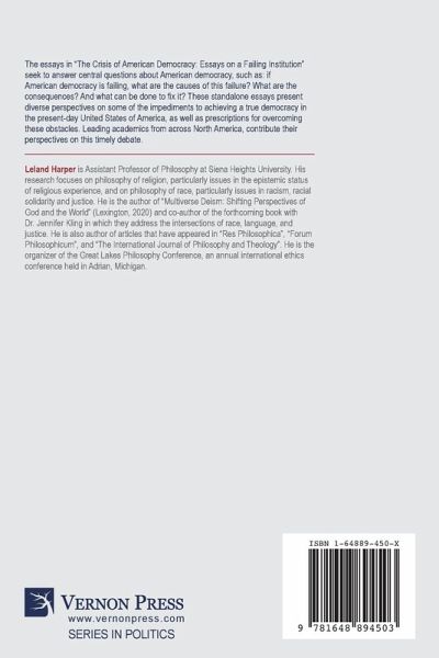 The essays in "The Crisis of American Democracy: Essays on a Failing Institution" seek to answer central questions about American democracy, such as: if American democracy is failing, what are the causes of this failure? What are the consequences? And what can be done to fix it? These standalone essays present diverse perspectives on some of the impediments to achieving a true democracy in the present-day United States of America, as well as prescriptions for overcoming these obstacles. Leading academics from across North America, contribute their perspectives on this timely debate.