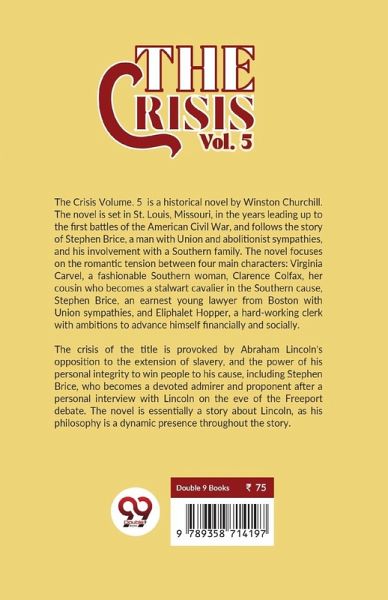 The Crisis is a historical novel by Winston Churchill. The novel is set in St. Louis, Missouri, in the years leading up to the first battles of the American Civil War, and follows the story of Stephen Brice, a man with Union and abolitionist sympathies, and his involvement with a Southern family. The novel focuses on the romantic tension between four main characters: Virginia Carvel, a fashionable Southern woman, Clarence Colfax, her cousin who becomes a stalwart cavalier in the Southern cause, Stephen Brice, an earnest young lawyer from Boston with Union sympathies, and Eliphalet Hopper, a hard-working clerk with ambitions to advance himself financially and socially. The crisis of the title is provoked by Abraham Lincoln's opposition to the extension of slavery, and the power of his personal integrity to win people to his cause, including Stephen Brice, who becomes a devoted admirer and proponent after a personal interview with Lincoln on the eve of the Freeport debate. The novel is essentially a story about Lincoln, as his philosophy is a dynamic presence throughout the story.