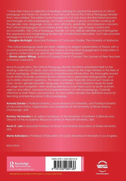Since its publication, The Critical Pedagogy Reader has firmly established itself as the leading collection of classic and contemporary essays by the major thinkers in the field of critical pedagogy. While retaining its comprehensive introduction, this thoroughly revised fourth edition includes updated section introductions, expanded bibliographies, and up-to-date classroom questions. The book is arranged topically around such issues as class, racism, gender/sexuality, language and literacy, and classroom issues for ease of usage and navigation. New reading selections cover topics such as youth activism, agency and affect, and practical implementations of critical pedagogy. Carefully attentive to both theory and practice, this new edition remains the definitive source for teaching and learning about critical pedagogy.