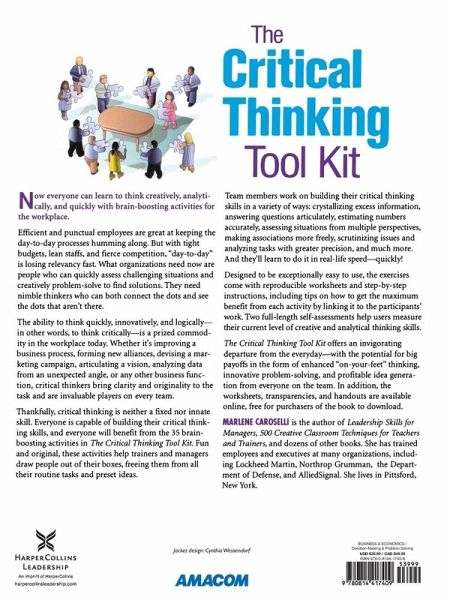 Critical thinking--the ability to approach a problem both analytically and creatively--is the bedrock of success for companies and their people. Fortunately, it's a skill that can be learned. The Critical Thinking Toolkit gets employees thinking better and faster with training exercises that offer an invigorating departure from the everyday and the potential for big payoffs in the form of enhanced "on-your-feet" thinking, innovative problem-solving, and profitable idea generation from everyone on the team. Using hands-on activities and ready-to-use assessments, team members will learn how to challenge assumptions, brainstorm divergent ideas, and then pinpoint the ones that best benefit your organization. And they'll learn to do it in a way that not only increases their work quality, but also their productivity. Unimaginative. Risk-adverse. Prone to groupthink. These are not just empty complaints about today's employees. American businesses are suffering from systemic burnout resulting in a widespread lack of creativity. But this unimaginative thinking doesn't need to plague your workplace. With The Critical Thinking Toolkit, you and your team have everything you need to think quickly, analytically, and creatively.