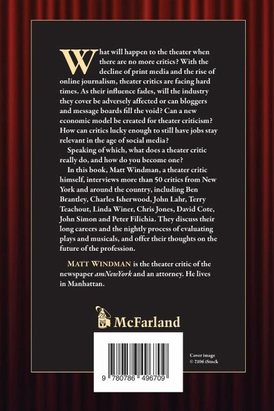 What will happen to the theater when there are no more critics? With the decline of print media and the rise of online journalism, theater critics are facing hard times. As their influence fades, will the industry they cover be adversely affected or can bloggers and message boards fill the void? Can a new economic model be created for theater criticism? How can critics lucky enough to still have jobs stay relevant in the age of social media? Speaking of which, what does a theater critic really do, and how do you become one? In this book, Matt Windman, a theater critic himself, interviews more than 50 critics from New York and around the country, including Ben Brantley, Charles Isherwood, John Lahr, Terry Teachout, Linda Winer, Chris Jones, David Cote, John Simon and Peter Filichia. They discuss their long careers and the nightly process of evaluating plays and musicals, and offer their thoughts on the future of the profession.