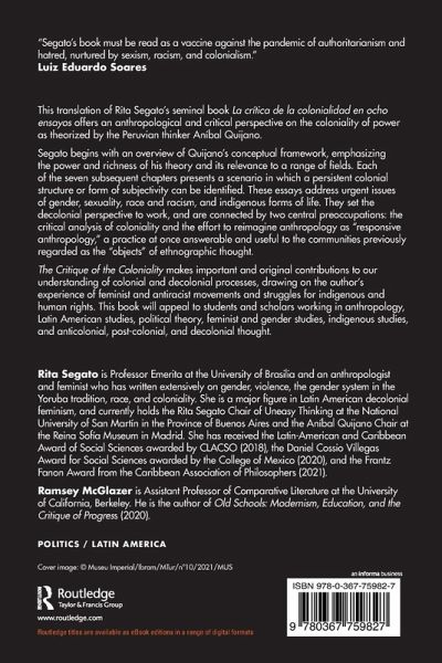 The Critique of the Coloniality makes important and original contributions to our understanding of colonial and decolonial processes, drawing on the author's experience of feminist and antiracist movements and struggles for indigenous and human rights. This book will appeal to students and scholars working in anthropology, Latin American studies, political theory, feminist and gender studies, indigenous studies, and anticolonial, post-colonial, and decolonial thought.