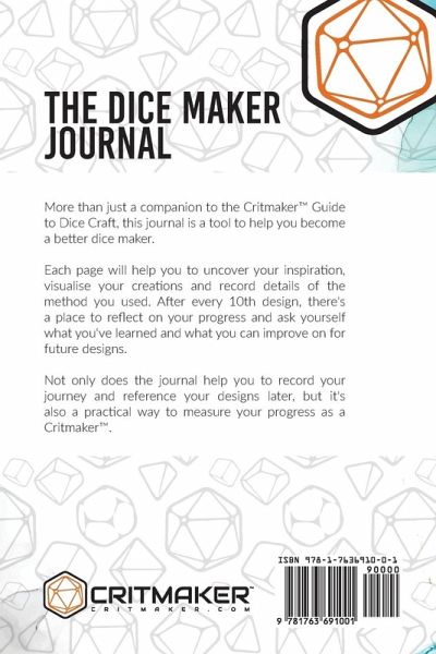More than just a companion to the Critmaker(TM) Guide to Dice Craft, this journal is a tool to help you become a better dice maker. Each page will help you to uncover your inspiration, visualise your creations and record details of the method you used. After every 10th design, there's a place to reflect on your progress and ask yourself what you've learned and what you can improve on for future designs. Not only does the journal help you to record your journey and reference your designs later, but it's also a practical way to measure your progress as a Critmaker(TM).