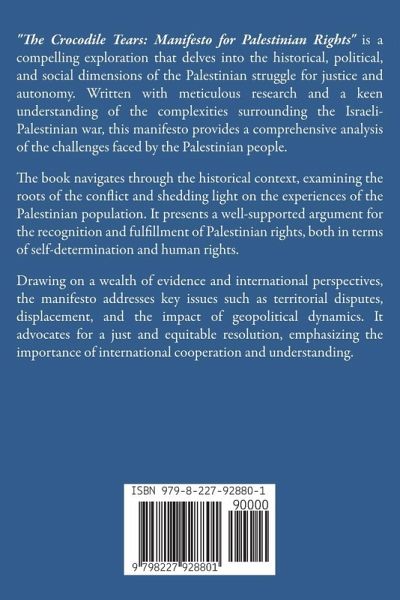 "The Crocodile Tears: A Manifesto for Palestinian Rights" is a compelling exploration that delves into the historical, political, and social dimensions of the Palestinian struggle for justice and autonomy. Written with meticulous research and a keen understanding of the complexities surrounding the Israeli-Palestinian war, this manifesto provides a comprehensive analysis of the challenges faced by the Palestinian people. The book navigates through the historical context, examining the roots of the conflict and shedding light on the experiences of the Palestinian population. It presents a well-supported argument for the recognition and fulfillment of Palestinian rights, both in terms of self-determination and human rights. Drawing on a wealth of evidence and international perspectives, the manifesto addresses key issues such as territorial disputes, displacement, and the impact of geopolitical dynamics. It advocates for a just and equitable resolution, emphasizing the importance of international cooperation and understanding.