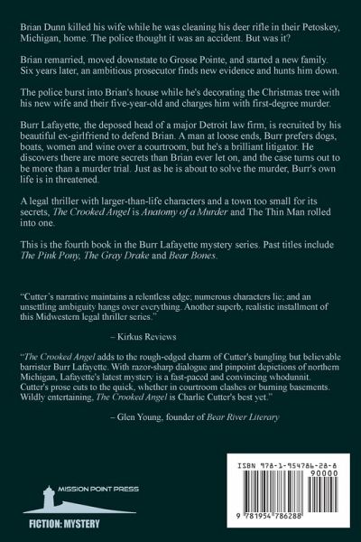 Brian Dunn accidentally shot his wife while he was cleaning his deer rifle. He remarried, moved from Petoskey to Grosse Pointe, Michigan, and started a new family. Six years later, an ambitious prosecutor hunts him down. The police burst into Brian's house while he's decorating the Christmas tree with his new wife and their five year old daughter. Brian is charged with first degree murder. Burr Lafayette, the deposed head of a major Detroit law firm is recruited by his lovely, ex-girlfriend to defend Brian. A man at loose ends, Burr prefers dogs, boats, wine and women over a courtroom, but he's a brilliant litigator. He discovers there are more secrets than Brian ever let on, and the case turns out to be more than a murder trial. Just as he about to solve the murder, Burr's own life is in danger. A legal thriller with larger than life characters and a town too small for its secrets, The Crooked Angel is Anatomy of a Murder and The Thin Man rolled into one.