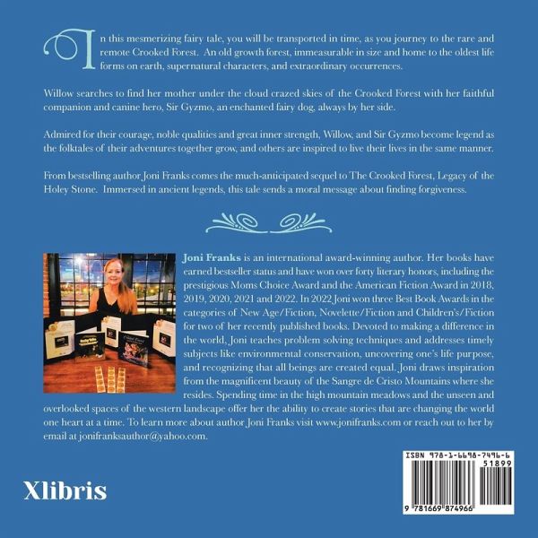 In this mesmerizing fairy tale, you will be transported in time, as you journey to the rare and remote Crooked Forest. An old growth forest, immeasurable in size and home to the oldest life forms on earth, supernatural characters, and extraordinary occurrences. Willow searches to find her mother under the cloud crazed skies of the Crooked Forest with her faithful companion and canine hero, Sir Gyzmo, an enchanted fairy dog, always by her side. Admired for their courage, noble qualities and great inner strength, Willow, and Sir Gyzmo become legend as the folktales of their adventures together grow, and others are inspired to live their lives in the same manner. From bestselling author Joni Franks comes the much-anticipated sequel to The Crooked Forest, Legacy of the Holey Stone. Immersed in ancient legends, this tale sends a moral message about finding forgiveness.