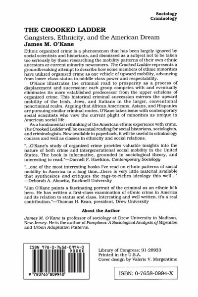 Ethnic organized crime is a phenomenon that has been largely ignored by social scientists and historians, and dismissed as a subject not to be taken too seriously by those researching the mobility patterns of their own ethnic ancestors or current minority newcomers. The Crooked Ladder represents a groundbreaking attempt to describe how some members of ethnic minorities have utilized organized crime as one vehicle of upward mobility, advancing from lower-class status to middle-class power and respectability.O'Kane illustrates the criminal road to prosperity as a process of displacement and succession: each group competes with and eventually eliminates its more established predecessor from the upper echelons of organized crime. This historical criminal succession mirrors the upward mobility of the Irish, Jews, and Italians in the larger, conventional noncriminal realm. Arguing that African Americans, Asians, and Hispanics are pursuing similar criminal routes, O'Kane takes issue with contemporary social scientists who view the current plight of minorities as unique in American social life.As a fundamental rethinking of the American ethnic experience with crime, The Crooked Ladder will be essential reading for social historians, sociologists, and criminologists. Now available in paperback, it will be useful in criminology courses and well as classes in ethnicity and social relations.