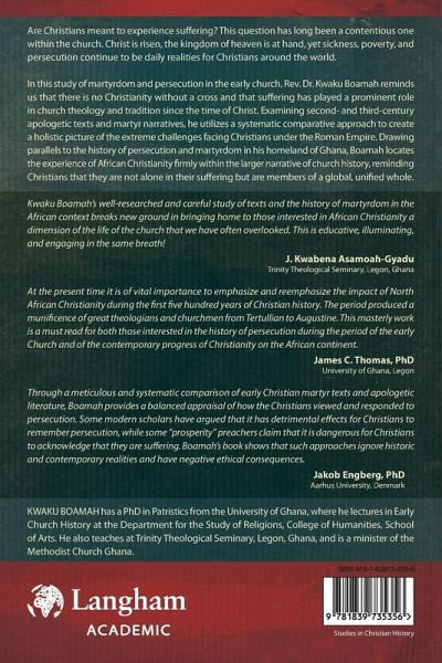 Are Christians meant to experience suffering? This question has long been a contentious one within the church. Christ is risen, the kingdom of heaven is at hand, yet sickness, poverty, and persecution continue to be daily realities for Christians around the world. In this study of martyrdom and persecution in the early church, Rev. Dr. Kwaku Boamah reminds us that there is no Christianity without a cross and that suffering has played a prominent role in church theology and tradition since the time of Christ. Examining second- and third-century apologetic texts and martyr narratives, he utilizes a systematic comparative approach to create a holistic picture of the extreme challenges facing Christians under the Roman Empire. Drawing parallels to the history of persecution and martyrdom in his homeland of Ghana, Boamah locates the experience of African Christianity firmly within the larger narrative of church history, reminding Christians that they are not alone in their suffering but are members of a global, unified whole.