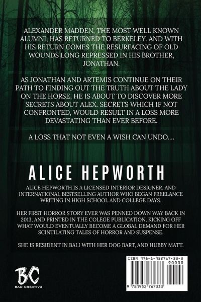 Be Careful What You Wish For....At a lonely crossroad... by the stroke of midnight Alexander Madden, the most well known alumni has returned to Berkeley. And with his return comes the resurfacing of old wounds long repressed in his brother Jonathan. As Jonathan and Artemis continue on their path to finding out the truth about the Lady on the horse, he is about to discover more secrets about Alex. Secrets which if not confronted, would result in a loss more devastating than ever before.A loss that not even a wish can undo.