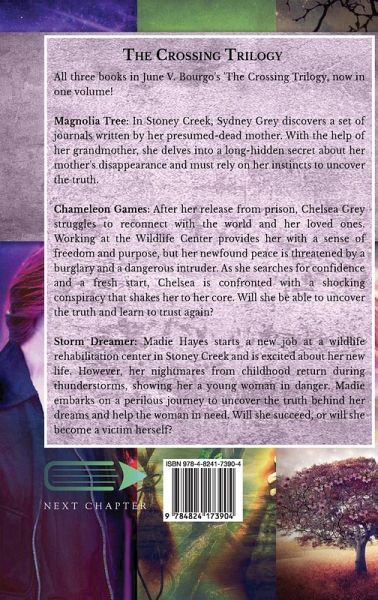 All three books in June V. Bourgo's 'The Crossing Trilogy, now in one volume! Magnolia Tree: In Stoney Creek, Sydney Grey discovers a set of journals written by her presumed-dead mother. With the help of her grandmother, she delves into a long-hidden secret about her mother's disappearance and must rely on her instincts to uncover the truth. Chameleon Games: After her release from prison, Chelsea Grey struggles to reconnect with the world and her loved ones. Working at the Wildlife Center provides her with a sense of freedom and purpose, but her newfound peace is threatened by a burglary and a dangerous intruder. As she searches for confidence and a fresh start, Chelsea is confronted with a shocking conspiracy that shakes her to her core. Will she be able to uncover the truth and learn to trust again? Storm Dreamer: Madie Hayes starts a new job at a wildlife rehabilitation center in Stoney Creek and is excited about her new life. However, her nightmares from childhood return during thunderstorms, showing her a young woman in danger. Madie embarks on a perilous journey to uncover the truth behind her dreams and help the woman in need. Will she succeed, or will she become a victim herself?