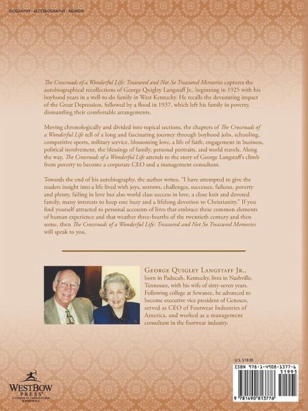 A West Kentucky boy from a well-to-do family experiences the trauma of the Great Depression, followed by the devastating flood of 1937. His family is thrown into poverty. His story of this tragedy and what followed is a fascinating journey through his challenges in childhood work, education, sports, military service, love, faith, business, politics, religion, family, and world travel. At the age of eighty-seven, he looked back on the many key events of his life and created an impressive autobiography-The Crossroads of a Wonderful Life: Treasured and Not-So-Treasured Memories, which he published and shared with family and friends. It was well received and now is offered to a larger audience. Witness the ups and downs of his and his family's lives-a remarkable replay of a business career that included noteworthy progress in a major company, almost unbelievable corporate intrigue, spying on the competition, CEO confrontation and early retirement, a new and exciting CEO role, public service, and his lifelong commitment to his Christian faith. Enjoy the wonderful travels and photos of his family and friends. Finally, he incorporates messages learned through life about his ideas for career selection by the young graduate, points for the new executive to consider, a financial plan for life, and evidences of his lifelong commitment to his Christian faith-all of this enhanced by a revealing collection of photographs.
