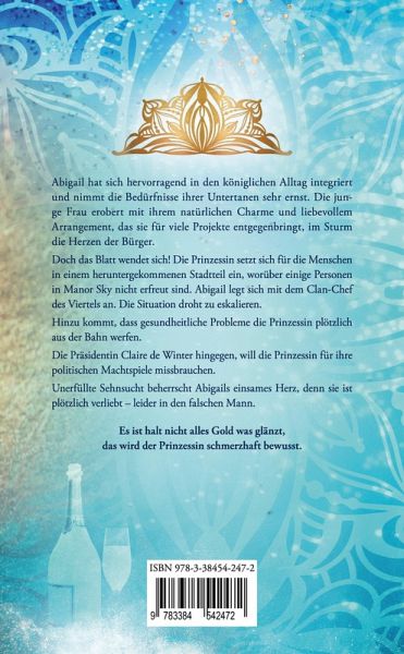 Abigail wächst über sich hinaus - und entdeckt, was ihr Herz wirklich sucht.Tauche zurück in die magische Welt von Manor Sky ...Abigail hat sich hervorragend in den königlichen Alltag integriert und nimmt die Bedürfnisse ihrer Untertanen sehr ernst. Die junge Frau erobert mit ihrem natürlichen Charme und liebevollem Arrangement, das sie für viele Projekte entgegenbringt, im Sturm die Herzen der Bürger.Doch das Blatt wendet sich! Die Prinzessin setzt sich für die Menschen in einem heruntergekommenen Stadtteil ein, worüber einige Personen in Manor Sky nicht erfreut sind. Abigail legt sich mit dem Clan Chef des Viertels an. Die Situation droht zu eskalieren.Hinzu kommt, dass gesundheitliche Probleme die Prinzessin plötzlich aus der Bahn werfen.Die Präsidentin Claire de Winter hingegen, will die Prinzessin für ihre politischen Machtspiele missbrauchen. Unerfüllte Sehnsucht beherrscht Abigails einsames Herz, denn sie ist plötzlich verliebt - leider in den falschen Mann. Es ist halt nicht alles Gold was glänzt, das wird der Prinzessin schmerzhaft bewusst.