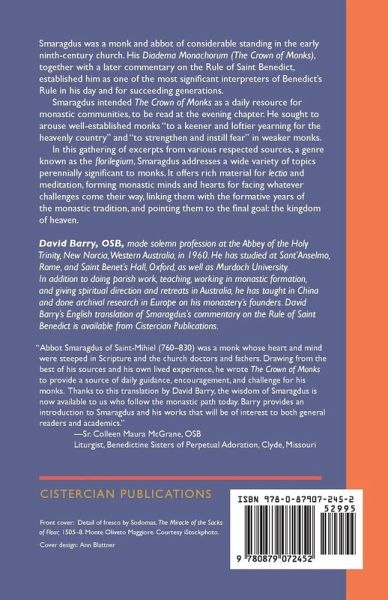 Smaragdus was a monk and abbot of considerable standing in the early ninth century church. His Diadema Monachorum (The Crown of Monks), together with a later commentary on the Rule of Saint Benedict, established him as one of the most significant interpreters of Benedict's Rule in his day and for succeeding generations. Smaragdus intended The Crown of Monks as a daily resource for monastic communities, to be read at the evening chapter. He sought to arouse well-established monks "to a keener and loftier yearning for the heavenly country" and "to strengthen and instill fear" in weaker monks. In this gathering of excerpts from various respected sources, a genre known as the florilegium, Smaragdus addresses a wide variety of topics perennially significant to monks. It offers rich material for lectio and meditation, forming monastic minds and hearts for facing whatever challenges come their way, linking them with the formative years of the monastic tradition, and pointing them to the final goal: the kingdom of heaven.