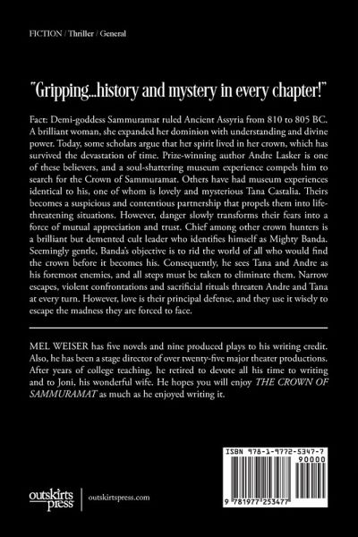 Nothing is more satisfying to an avid reader than a book that snares attention in its first pages and won't let go until its final words. Such a book is THE CROWN OF SAMMURAMAT. In pitting the mysteries of Ancient Assyria against the forces of contemporary America, this book carries a reader breathtakingly from a shocking opening to a glorious and gratifying conclusion. Enlightening. Imaginative. Hypnotic. It is a reading experience the memory of which will bring smiles of satisfaction long after it has been put on a shelf. THE CROWN OF SAMMURAMAT, a thriller to be remembered.