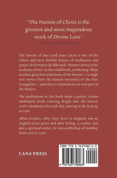'The Passion of Christ is the greatest and most stupendous work of Divine Love. The greatest and most overwhelming work of God's love.'-St Paul of the Cross The Passion of Our Lord Jesus Christ is one of the richest sources of meditation and prayer and a most fruitful one; as St Francis de Sales said, 'Mount Calvary is the academy of love'. In this small book Archbishop Alban Goodier gives first a harmony of the Passion-a single text woven from the Passion narratives of the four Evangelists-and then 52 meditations on each part of the Passion. The meditations in this book make a perfect Lenten meditation book, entering deeply into the Passion with a meditation for each day, starting in the lead up to Lent.