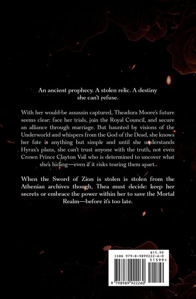 Theadora Moore has finally found her place within the Athenian Court. With her would-be assassin now imprisoned in the palace dungeon, the kingdom awaits her next steps-completing her trials, ascending to the Royal Council, and forging a powerful alliance through marriage. Yet, despite her willingness to embrace these new responsibilities, she is haunted by dark secrets. Thea can't stop dreaming of the Underworld, and she's desperate to figure out what her ancestor, the God of the Dead, wants from her. Until she understands, she can't trust anyone with the truth, not even Crown Prince Clayton Vail. As her secret meetings with Hyrax continue, they threaten everything she cares about, including her growing relationship with Clay, who is determined to uncover what she's hiding-even if it risks tearing them apart.