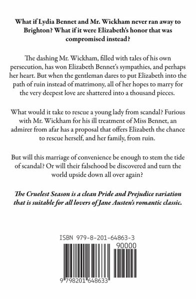 What if Lydia Bennet and Mr. Wickham never ran away to Brighton? What if it were Elizabeth's honor that was compromised instead? The dashing Mr. Wickham, filled with tales of his own persecution, has won Elizabeth Bennet's sympathies, and perhaps her heart. But when the gentleman dares to put Elizabeth into the path of ruin instead of matrimony, all of her hopes to marry for the very deepest love are shattered into a thousand pieces. What would it take to rescue a young lady from scandal? Furious with Mr. Wickham for his ill treatment of Miss Bennet, an admirer from afar has a proposal that offers Elizabeth the chance to rescue herself, and her family, from ruin. But will this marriage of convenience be enough to stem the tide of scandal? Or will their falsehood be discovered and turn the world upside down all over again? The Cruelest Season is a clean Pride and Prejudice variation that is suitable for all lovers of Jane Austen's romantic classic.