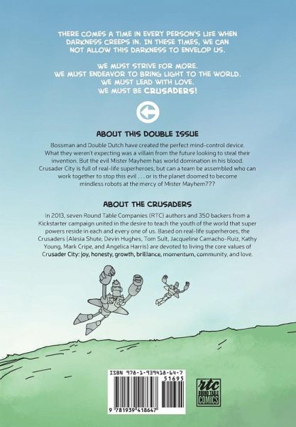 There comes a time in every person's life when darkness creeps in. In these times, we can not allow this darkness to envelop us. We must strive for more. We must endeavor to bring light to the world. We must lead with love. We must be CRUSADERS! About this Double Issue: Bossman and Double Dutch have created the perfect mind-control device. What they weren't expecting was a villain from the future looking to steal their invention. But the evil Mister Mayhem has world domination in his blood. Crusader City is full of real-life superheroes, but can a team be assembled who can work together to stop this evil ... or is the planet doomed to become mindless robots at the mercy of Mister Mayhem??? About the Crusaders: In 2013, seven Round Table Companies (RTC) authors and 350 backers from a Kickstarter campaign united in the desire to teach the youth of the world that super powers reside in each and every one of us. Based on real-life superheroes, the Crusaders (Alesia Shute, Devin Hughes, Tom Sult, Jacqueline Camacho-Ruiz, Kathy Young, Mark Cripe, and Angelica Harris) are devoted to living the core values of Crusader City: joy, honesty, growth, brilliance, momentum, community, and love.