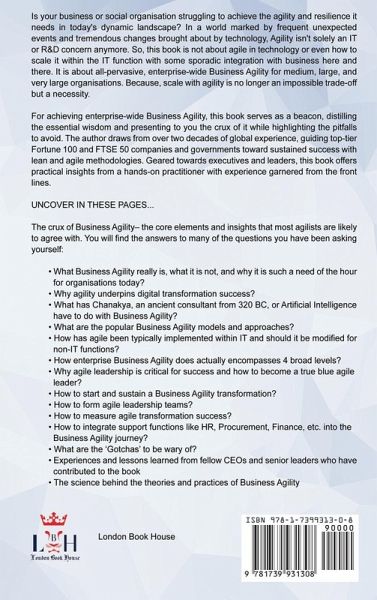 The Crux of Business Agility - What Every CEO and CXO Must Know The resilient way to lead, adapt sustainably, and leapfrog the competition In today's fast-paced and unpredictable business landscape, the ability to adapt swiftly and sustainably is not just a competitive advantage; it's a necessity. "The Crux of Business Agility - What Every CEO and CXO Must Know" is your essential guide to mastering this critical competency. It unlocks untapped profits and releases dormant energy and engagement. Geared towards executives and leaders, this book offers not just the basic theory, but also provides ample practical insights garnered from the frontlines. Authored by an industry expert with over two decades of hands-on experience in transforming top-tier global companies, this book distills the essence of business agility into actionable insights that every senior leader needs. Business Agility is indeed achievable by large enterprises - they can learn from small and nimble startups and act like high-growth software companies. In these pages, discover the core principles of agile leadership and learn how to foster a culture of continuous improvement and innovation across your organization. Explore real-world case studies and proven strategies for overcoming common challenges, from aligning executive teams to driving customer-centric transformations. With practical tools and frameworks, this book equips you to navigate the complexities of modern business, ensuring your enterprise not only survives but thrives. Whether you are facing digital disruption, regulatory changes, or market volatility, "The Crux of Business Agility" offers the guidance you need to stay ahead of the curve. It will help leaders like you to embrace agility, lead with resilience, and propel your organisation to new heights of success. Join the ranks of forward-thinking leaders who have already leveraged these insights to create more adaptive, responsive, and competitive enterprises. Your journey to sustainable leadership and unparalleled business agility starts here.