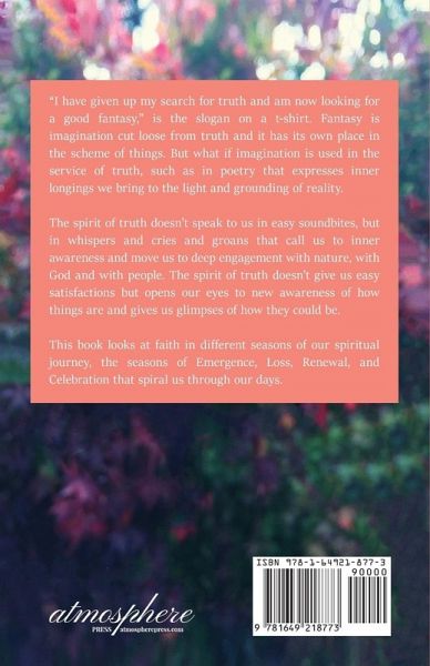 "I have given up my search for truth and am now looking for a good fantasy," is the slogan on a t-shirt. Fantasy is imagination cut loose from truth and it has its own place in the scheme of things. But what if imagination is used in the service of truth, such as in poetry that expresses inner longings we bring to the light and grounding of reality. The spirit of truth doesn't speak to us in easy soundbites, but in whispers and cries and groans that call us to inner awareness and move us to deep engagement with nature, with God and with people. The spirit of truth doesn't give us easy satisfactions but opens our eyes to new awareness of how things are and gives us glimpses of how they could be. This book looks at faith in different seasons of our spiritual journey, the seasons of Emergence, Loss, Renewal, and Celebration that spiral us through our days.