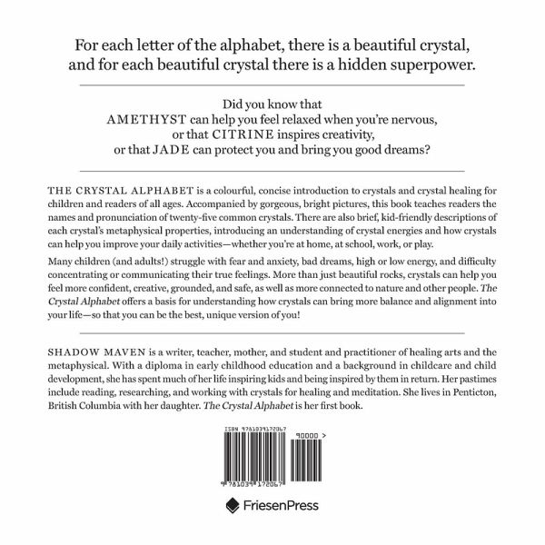 For each letter of the alphabet, there is a beautiful crystal, and for each beautiful crystal there is a hidden superpower. Did you know that amethyst can help you feel relaxed when you're nervous, or that citrine inspires creativity, or that jade can protect you and bring you good dreams? The Crystal Alphabet is a colourful, concise introduction to crystals and crystal healing for children and readers of all ages. Accompanied by gorgeous, bright pictures, this book teaches readers the names and pronunciation of twenty-five common crystals. There are also brief, kid-friendly descriptions of each crystal's metaphysical properties, introducing an understanding of crystal energies and how crystals can help you improve your daily activities-whether you're at home, at school, work, or play. Many children (and adults!) struggle with fear and anxiety, bad dreams, high or low energy, and difficulty concentrating or communicating their true feelings. More than just beautiful rocks, crystals can help you feel more confident, creative, grounded, and safe, as well as more connected to nature and other people. The Crystal Alphabet offers a basis for understanding how crystals can bring more balance and alignment into your life-so that you can be the best, unique version of you!