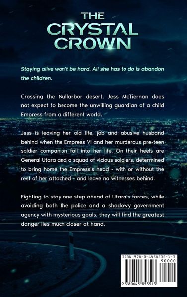 Staying alive won't be hard. All she has to do is abandon the children. Crossing the Nullarbor desert, Jess McTiernan does not expect to become the unwilling guardian of a child Empress from a different world. Jess is leaving her old life, job and abusive husband behind when the Empress Vi and her murderous pre-teen soldier companion fall into her life. On their heels are General Utara and a squad of vicious soldiers, determined to bring home the Empress's head - with or without the rest of her attached - and leave no witnesses behind. Fighting to stay one step ahead of Utara's forces, while avoiding both the police and a shadowy government agency with mysterious goals, they will find the greatest danger lies much closer at hand. The Crystal Crown is the first book in The War of the Exiles, a four-book modern-day sci-fi action adventure. Our world and theirs collide in this character-driven, fast-paced and thought-provoking high-concept novel. Discover the fate of The Crystal Crown today.