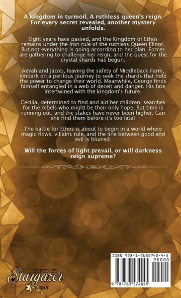 A kingdom in turmoil. A ruthless queen's reign. For every secret revealed, another mystery unfolds. Eight years have passed, and the Kingdom of Ethos remains under the iron rule of the ruthless Queen Elinor. But not everything is going according to her plan. Forces are gathering to challenge her reign, and the quest for the crystal shards has begun.Aevah and Jacob, leaving the safety of Middleback Farm, embark on a perilous journey to seek the shards that hold the power to change their world. Meanwhile, George finds himself entangled in a web of deceit and danger. His fate intertwined with the kingdom's future.Cecilia, determined to find and aid her children, searches for the rebels who might be their only hope. But time is running out, and the stakes have never been higher. Can she find them before it's too late?The battle for Ethos is about to begin in a world where magic flows, villains rule, and the line between good and evil is blurred. Will the forces of light prevail, or will darkness reign supreme?