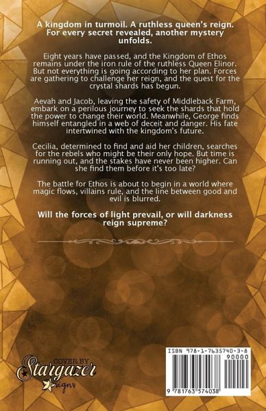 A kingdom in turmoil. A ruthless queen's reign. For every secret revealed, another mystery unfolds. Eight years have passed, and the Kingdom of Ethos remains under the iron rule of the ruthless Queen Elinor. But not everything is going according to her plan. Forces are gathering to challenge her reign, and the quest for the crystal shards has begun.Aevah and Jacob, leaving the safety of Middleback Farm, embark on a perilous journey to seek the shards that hold the power to change their world. Meanwhile, George finds himself entangled in a web of deceit and danger. His fate intertwined with the kingdom's future.Cecilia, determined to find and aid her children, searches for the rebels who might be their only hope. But time is running out, and the stakes have never been higher. Can she find them before it's too late?The battle for Ethos is about to begin in a world where magic flows, villains rule, and the line between good and evil is blurred. Will the forces of light prevail, or will darkness reign supreme?