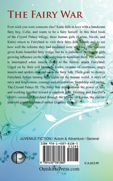 strong>The Crystal Palace III: The Fairy War Ever wish you were someone else? Katie falls in love with a handsome fairy boy, Colin, and wants to be a fairy herself. In this third book of the Crystal Palace trilogy, three human girls (Karina, Nicole, and Katie) return to Fairyland to visit their fairy folk friends and to see the effect of the civil rights reforms they had earlier mediated for the ogres and trolls, previously second class citizens in Fairyland. The Sorcerer gives Katie beautiful fairy wings, but he is jealous of the human girls' growing influence on the king and plans to humiliate them. His scheme is interrupted when insects (huge to the fairies) attack Fairyland. Urged on by their evil tarantula leader, swarms of enormous, angry insects and spiders descend upon the fairy folk. Their goal: to destroy Fairyland, before turning their sights on the human world. A story of envy and forgiveness, courage and cooperation, friendship and caring, The Crystal Palace III: The Fairy War demonstrates the power of respect for others and working together toward a common goal. Exciting and fanciful- a child's version of Fairyland through the artistry of Karina, the eleven-year-old granddaughter of author Grammy Hauser.