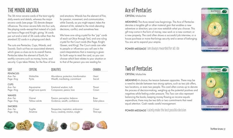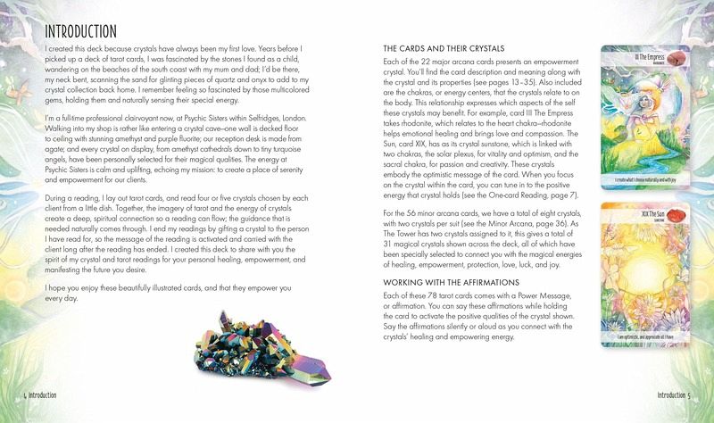 Take the tarot beyond divination into the magical realm of self-empowerment with this beautiful 78-card deck, which is infused with the wisdom of crystals and accompanied by a 64-page guidebook. For many centuries, both tarot cards and crystals have been used as powerful divination techniques—and they come together in The Crystal Power Tarot. Featuring more than thirty stunning stones throughout the deck, every tarot card depicts a lavish artist-commissioned tarot image. The book provides interpretations for all the cards, plus the properties of their crystals and five spreads to try—from a simple card of the day to a seven-card chakra spread for healing. Each card also includes an empowerment affirmation, which provides a way for you to declare your intention and connect with the card’s crystal, thus taking action to influence your future and make your dreams a reality. From relationship advice to career guidance, this unique crystal tarot illuminates what’s important to you now, and gives you the means to make your wishes come true.