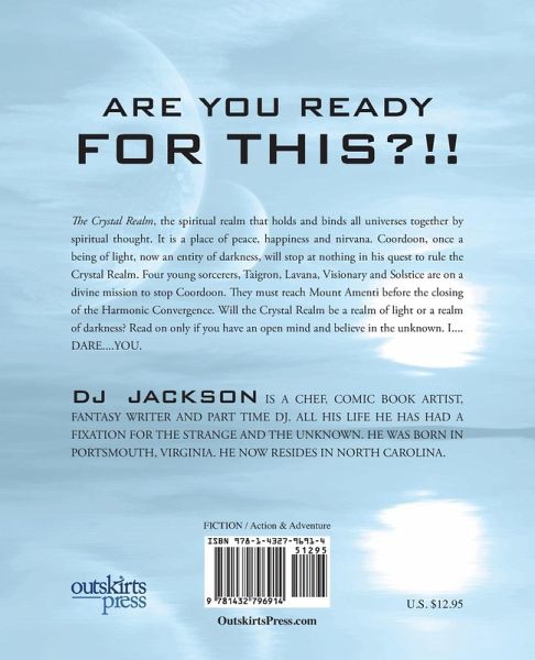 The Crystal Realm, the spiritual realm that holds and binds all universes together by spiritual thought. It is a place of peace, happiness and nirvana. Coordoon, once a being of light, now an entity of darkness, will stop at nothing in his quest to rule the Crystal Realm. Four young sorcerers, Taigron, Lavana, Visionary and Solstice are on a divine mission to stop Coordoon. They must reach Mount Amenti before the closing of the Harmonic Convergence. Will the Crystal Realm be a realm of light or a realm of darkness? Read on only if you have an open mind and believe in the unknown. I....DARE....YOU.