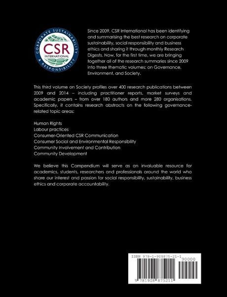 In this Compendium, CSR International has compiled summaries of the best research on corporate sustainability, social responsibility and business ethics since 2009. This third volume on Society profiles over 400 research publications between 2009 and 2014 - including practitioner reports, market surveys and academic papers - from over 180 authors and more 280 organisations. Specifically, it contains research abstracts on the following society-related topic areas: Human Rights Labour practices Consumer-Oriented CSR Communication Consumer Social and Environmental Responsibility Community Involvement and Contribution Community Development We believe this Compendium will serve as an invaluable resource for academics, students, researchers and professionals around the world who share our interest and passion for social responsibility, sustainability, business ethics and corporate accountability.