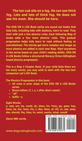 This book has about 880 words. The DOG ON A LOG Book series helps kids, including kids with dyslexia, learn to read. They are sound out books that start with just a few phonics rules. Each following Step of books adds a few more phonics rules and sight words. This gradual progression helps kids learn to read without feeling so overwhelmed. Start anywhere in the series based on your child's reading skills. The word list below will help you decide where in the series your child should start. Printable game boards, flashcards, handwriting sheets, and more are available to for additional practice. Information on the printables is provided in each book. The (purple) Let's GO! books have fewer words for new or less confident readers. The (red) chapter books are longer for more reading practice. Kids enjoy these stories that get more complex and longer as more phonics are added throughout the series. Books can be purchased individually or as collection volumes. This is an individual Step 2 Chapter Book. Additional information on using this series is available in the digital book HOW TO USE DECODABLE BOOKS TO TEACH READING. DOG ON A LOG Books follow an Orton Gillingham/systematic-phonics progression. DOG ON A LOG "What Step Should We Start With?" Word List Have your child read the following words. If they can't read every word in a Step, that is probably the step they should start with. For some kids, you may want to start at an earlier Step so they can build confidence in their reading ability. Step 1 fin, mash, sock, sub, cat, that, Dan's Step 2 less, bats, tell, mall, chips, whiff, falls Step 3 bangs, dank, honk, pings, chunk, sink, gong, rungs Step 4 silk, fluff, smash, krill, drop, slim, whisk Step 5 hunch, crate, rake, tote, inch, mote, lime Step 6 child, molts, fold, hind, jolt, post, colds Step 7 strive, scrape, splint, twists, crunch, prints, blend Step 8 finish, denim, within, bathtub, sunset, medic, habit Step 9 hundred, goldfinch, tree, wheat, inhale, play, Joe Step 10 be, remake, spry, repeat, silo, sometime, pinwheel Step 11 far, north, spire, turn, inhabit, calculate, Wyoming Many early reader books or leveled books are written so they cannot be sounded out. Kids often struggle and grow frustrated when they can't sound out the words. However, kids who have been taught the phonics and sight words in DOG ON A LOG Books can be proud when they are able to sound out and read almost every word. Paper books are optimized for learners with dyslexia. They have cream colored paper, black and white images, and large Verdana font. Research has shown Verdana is one of the most dyslexia-friendly fonts. More DOG ON A LOG Books: DOG ON A LOG Pup Books ---Before the Squiggle Code (Pre-Reading Skills) ---The Squiggle Code (Learning Letters and Words) ---Kids' Squiggles (First Stories) DOG ON A LOG Parent and Teacher Guides ---Teaching a Struggling Reader: One Mom's Experience with Dyslexia ---How to Use Decodable Books to Teach Reading Relevant portions of the DOG ON A LOG Phonics Progression (Scope and Sequence) and the Quick Assessment Tool ("What Step Should We Start With?" Word List) are inside each book. WATCH FOR MORE STEPS AND BOOKS COMING SOON