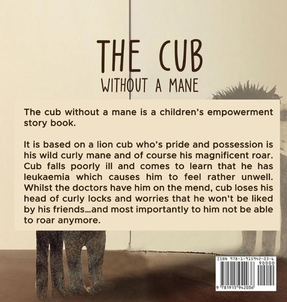 The cub without a mane is a children's empowerment story book. It is based on a lion cub who's pride and possession is his wild curly mane and of course his magnificent roar. Cub falls poorly and comes to learn that he has leukaemia which causes him to feel rather unwell. Whilst the doctors have him on the mend cub loses his head of curly locks and worries that he won't be liked by his friends...and most importantly to him be able to roar anymore.