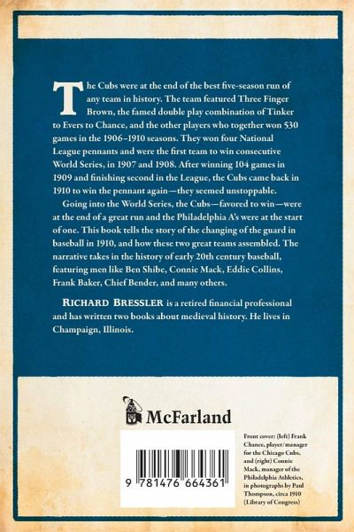 The Cubs were at the end of the best five-season run of any team in history. The team featured Three Finger Brown, the famed double play combination of Tinker to Evers to Chance, and the other players who together won 530 games in the 1906-1910 seasons. They won four National League pennants and were the first team to win consecutive World Series, in 1907 and 1908. After winning 104 games in 1909 and finishing second in the League, the Cubs came back in 1910 to win the pennant again--they seemed unstoppable. Going into the World Series, the Cubs--favored to win--were at the end of a great run and the Philadelphia A's were at the start of one. This book tells the story of the changing of the guard in baseball in 1910, and how these two great teams assembled. The narrative takes in the history of early 20th century baseball, featuring men like Ben Shibe, Connie Mack, Eddie Collins, Frank Baker, Chief Bender, and many others.