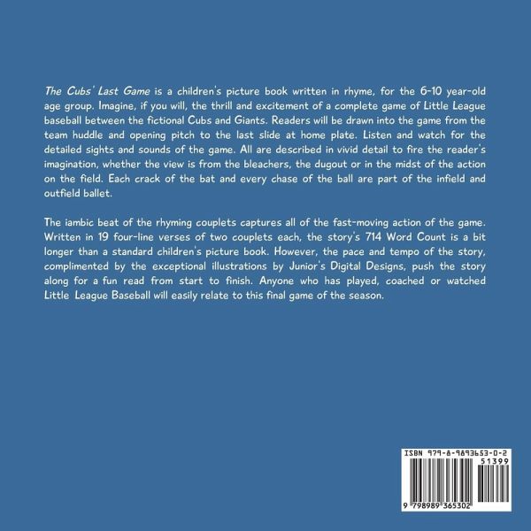 "The Cubs' Last Game" is a children's picture book written in rhyme, for the 6-10 year-old age group. Imagine, if you will, the thrill and excitement of a complete game of Little League baseball between the fictional Cubs and Giants. Readers will be drawn into the game from the team huddle and opening pitch to the last slide at home plate. Listen and watch for the detailed sights and sounds of the game. All are described in vivid detail to fire the reader's imagination, whether the view is from the bleachers, the dugout or in the midst of the action on the field. Each crack of the bat and every chase of the ball are part of the infield and outfield ballet.The iambic beat of the rhyming couplets captures all of the fast-moving action of the game. Written in 19 four-line verses of two couplets each, the story's 714 Word Count is a bit longer than a standard children's picture book. However, the pace and tempo of the story, complimented by the exceptional illustrations by Junior's Digital Designs, push the story along for a fun read from start to finish. Anyone who has played, coached or watched Little League Baseball will easily relate to this final game of the season.