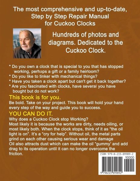 The Cuckoo Clock Owner?s Repair Manual Series: Clock Repair you can Follow Along The most comprehensive and most up-to-date, Step by Step Repair Manual for Cuckoo Clock Owners. Hundreds of photos and diagrams. Dedicated to the Cuckoo Clock. Updated 2023 edition.Do you own a clock that is special to you that has stopped working, perhaps a gift or a family heirloom? This book is for you. Do you like to tinker with mechanical things? This book is for you. Have you taken a clock apart but can't get it back together? This book is for you. Are you fascinated with clocks, have several you have bought but do not work? This book is for you. Be bold. Take on your project. This book will hold your hand every step of the way and guide you to success. YOU CAN DO IT. Why does a Cuckoo Clock Stop Working? Most likely, it is because the works are dirty, need oiling, or most likely both. When the clock stops, think of it as "the oil light is on". It's a "cry for help". Without oil, the metal parts grind on each other, causing severe wear and damage. Oil also attracts dust which can make the oil "gummy' and add drag to its operation until it can no longer overcome the friction. If a clock is oiled regularly [every three to five years], chances are you will only ever need to reoil your clock. If the clock is allowed to run until it stops, the only sure way to service it is to remove the works from its case, dismantle the parts, clean, service, and put the movement back together with fresh oil and correct adjustment. This book will teach you how to do all this. Covered: Regula, Baduf, Hubert Herr, Schatz, Rack & Snail, Count Wheel, Bellows and Weights, Movement ID, Cleaning and Oiling, Complete Step-by-Step Repair Procedure.