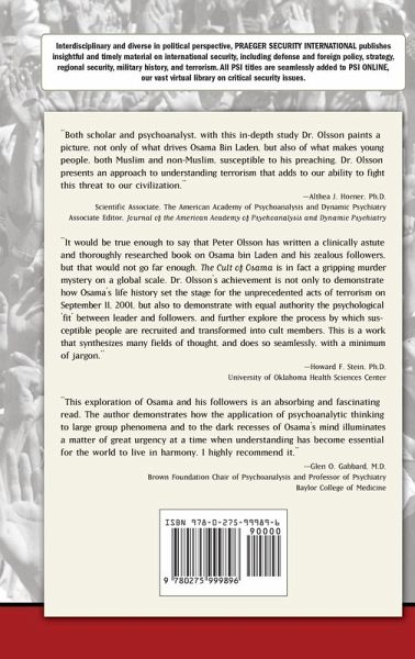 In The Cult of Osama, Psychiatrist Peter Olsson examines Osama bin Laden's early life experiences and explains, from a psychoanalytical perspective, how those created a mind filled with perverse rage at America, as well as why his way of thinking makes bin Laden in many cases a hero to Arab and Muslim youths. Many other writings totally demonize bin Laden, and therein strangely play into putting this troubled man onto a pedestal, says Olsson, who spent 25 years on a social psychological and psychoanalytical study of destructive cults and cult leaders. There are many journalistic, political, military, and intelligence books about bin Laden and his terror cult group. But this one offers a purely psychological and psychobiographical perspective on bin Laden and his mushrooming influence. Bin Laden's destructive Pied Piper appeal, leading youths to murder others and even themselves in suicide missions, stems from the peculiar and profoundly important synchrony of shared trauma and pain between bin Laden and Arab/Muslim youth, says Olsson. And we in the West neglect this topic, at our own peril. Among the insights Olsson provides as he traces the psychological threads of narcissistic wounds and unresolved grief from Osama's childhood are the death of his father when Osama was 10, separation from his mother even earlier, the humiliation of Osama as the son of a slave in his father's household, and his lifelong search for a surrogate older brother and father figures among radical Islamist teachers and mentors. Olsson also spotlights the idea that Osama experienced dark epiphanies as a young adult which further magnified and focused his unresolved disappointments and narcissistic rage. This psychobiography of one of the world's most notorious terrorists, written by an Assistant Professor at Dartmouth Medical School, shows how understanding the psychohistory and mindset of bin Laden could help prevent the development and actions of home-grown American and Western terrorists and their cells.