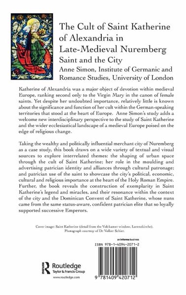 Saint Katherine of Alexandria was - after the Virgin Mary - arguably the most important female religious figure within medieval Europe. Despite this, many gaps in our knowledge remain as regards the significance and function of her cult within Germany. Simon's book addresses this lacunae, using Nuremberg as a case study to examine the ways in which the cult expressed itself - in literature, art; devotional practice, Patrician patronage, political strategy, urban space - and how the various forms of expression interacted to shape Patrician and civic identity.