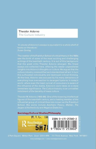 The creation of the Frankfurt School of critical theory in the 1920s saw the birth of some of the most exciting and challenging writings of the twentieth century. It is out of this background that the great critic Theodor Adorno emerged. His finest essays are collected here, offering the reader unparalleled insights into Adorno's thoughts on culture. He argued that the culture industry commodified and standardized all art. In turn this suffocated individuality and destroyed critical thinking. At the time, Adorno was accused of everything from overreaction to deranged hysteria by his many detractors. In today's world, where even the least cynical of consumers is aware of the influence of the media, Adorno's work takes on a more immediate significance. The Culture Industry is an unrivalled indictment of the banality of mass culture.