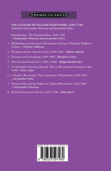 The Culture of English Puritanism is a major contribution to the debate on the nature and extent of early modern Puritanism. In their introduction the editors provide an up-to-date survey of the long-standing debate on Puritanism, before proceeding to outline their own definition of the movement. They argue that Puritanism should be defined as a unique and vibrant religious culture, which was grounded in a distinctive psychological outlook and which manifested itself in a set of highly characteristic religious practices. In the subsequent essays, a distinguished group of contributors consider in detail some of the most important aspects of this culture, in particular sermon-gadding, collective fasting, strict observance of Sunday, iconoclasm, and puritan attempts to reform alternative popular culture of their ungodly neighbours. Other contributions chart the channels through which puritan culture was sustained in the 80-year period proceding the English Civil War, the failure of attempts by the puritan government of Interregnum England to impose this puritan culture on the English people, the subsequent emergence of Dissent after 1600