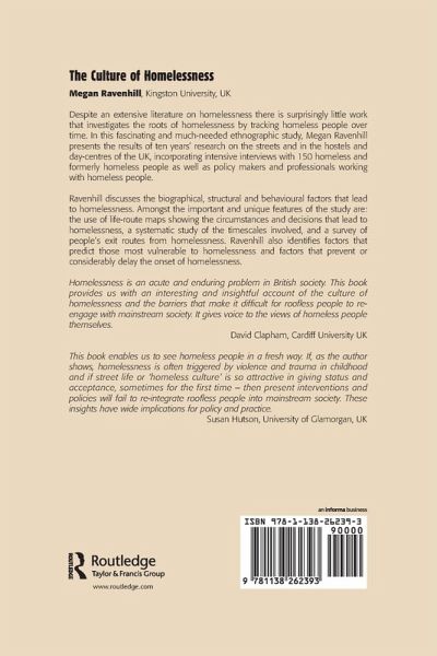 In this fascinating and much-needed ethnographic study, Megan Ravenhill presents the results of ten years' research on the streets and in the hostels and day-centres of the UK, incorporating intensive interviews with 150 homeless and formerly homeless people as well as policy makers and professionals working with homeless people.