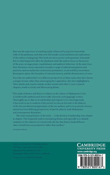 How was the experience of watching a play influenced by practices beyond the walls of the playhouse, and what were the broader social and historical implications of the culture of playgoing? The book sets out to answer such questions. Interested first in what happened within the playhouse itself, the authors focus on the person of the actor, on stage props, visual pleasure and audience behaviour. At the same time, their discussion moves outward to consider a range of cultural assumptions and practices - such as eucharistic controversy, prostitution, social mobility, iconoclasm, Renaissance optics, the formation of national memory, and the dissemination of news. Since the two authors have very different perspectives on these issues, they have chosen a unique format: rather than submerging their opposition, they have highlighted it. Their attacks and counter-attacks, as they contest each other's views in paired chapters, result in a lively and illuminating debate.