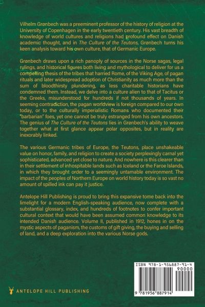 Vilhelm Grønbech was a preeminent professor of the history of religion at the University of Copenhagen in the early twentieth century. His vast breadth of knowledge of world cultures and religions had profound effect on Danish academic thought, and in The Culture of the Teutons, Grønbech turns his keen analysis toward his own culture, that of Germanic Europe. Grønbech draws upon a rich panoply of sources in the Norse sagas, legal rulings, and historical figures both living and mythological to deliver for us a compelling thesis of the tribes that harried Rome, of the Viking Age, of pagan rituals and later widespread adoption of Christianity as much more than the sum of bloodthirsty plundering, as less charitable historians have condemned them. Instead, we delve into a culture alien to that of Tacitus or the Greeks, misunderstood for hundreds if not thousands of years. In seeming contradiction, the pagan worldview is foreign compared to our own today, or to the culturally imperialistic Romans who documented their "barbarian" foes, yet one cannot be truly estranged from his own ancestors. The genius of The Culture of the Teutons lies in Grønbech's ability to weave together what at first glance appear polar opposites, but in reality are inexorably linked. The various Germanic tribes of Europe, the Teutons, place unshakeable value on honor, family, and religion to create a society perplexingly carnal yet sophisticated, advanced yet close to nature. And nowhere is this clearer than in their settlement of inhospitable lands such as Iceland or the Faroe Islands, in which they brought order to a seemingly untamable environment. The impact of the peoples of Northern Europe on world history today is so vast no amount of spilled ink can pay it justice. Antelope Hill Publishing is proud to bring this expansive tome back into the limelight for a modern English-speaking audience, now complete with a substantial glossary, index, and hundreds of footnotes to confer important cultural context that would have been assumed common knowledge to its intended Danish audience. Volume II, published in 1912, hones in on the mystic aspects of paganism, the customs of gift giving, the buying and selling of land, and a deep exploration into the various Norse gods.