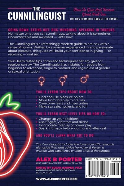Going down. Eating out. Rug-munching. Speaking in tongues. No matter what you call cunnilingus, talking about it is sometimes uncomfortable and awkward-Until now. The Cunnilinguist is a refreshingly modern guide to oral sex with a sense of humor. Written by a woman with experience at both ends of the tongue, this guide will build your confidence in giving-or receiving-oral sex. How to Give and Receive Great Oral Sex Did you know that lesbians report more orgasms than straight women and receiving oral sex can double a woman's chance of orgasm? Those are two findings from a large research study into the differences in orgasm frequency among gay, lesbian, bisexual, and heterosexual men and women. However, fear not; The Cunnilinguist has you covered. In #TheCunnilinguist... You'll learn tested tips, tricks and techniques that any giver or receiver can try. The Cunnilinguist: How To Give And Receive Great Oral Sex has insights and tips for readers from beginner to advanced, single to married, and regardless of gender or sexual orientation. You'll learn tips about how to: - Find and use pleasure points - Move from foreplay to oral sex - Overcome fears and insecurities - Change up your positions - Use fingers, vibrators and dildos - Incorporate roleplay or power play And you'll learn what not to do! The Cunnilinguist includes the latest scientific research alongside firsthand advice from a woman with experience on both ends of the tongue. Edited and Foreword by sexuality educator Susan Harper, PhD Excerpts: "What this book has turned out to be is even more exciting that I had ever hoped. Working closely with Alex to craft a guidebook that could be used by anyone who wants to learn to give or receive good cunnilingus, regardless of gender, has been an adventure. I especially loved that this book focuses on the experience of oral sex for both the giver and the receiver. The Cunnilinguist is the kind of book I wish I'd had available to my Sociology of Sexuality students. It manages to be both informative and well-researched while also being a fun, irreverent frolic. The description of the vaginal / vulvar / clitoral anatomy is worth the cover price alone, given how many people who possess these structures don't know what they're called or how they work. This refreshingly modern guide takes the business of giving and receiving pleasure seriously, but never takes itself too seriously. It's full of orgasm-inducing tips and techniques for both giver and receiver, presented with equal doses of good humor and practical, usable information." -Susan Harper PhD The Lover's Gift? Could this be the ultimate gift for your partner? Man, woman, transgender; bisexual, lesbian, straight, fluid; single, dating, married; polyamorous or monogamous, regardless of gender or sexual orientation, if you - or your partner - want to improve your experience of giving or receiving oral sex, minus the awkward conversations, this book is for you! Please. Pleasure. Enjoy.