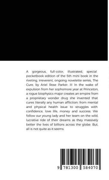 A gorgeous, full-color, illustrated, special pocketbook edition of the 5th mini book in the riveting, irreverent, ongoing novelette series, The Cure, by Ariel Rose Parker. III In the wake of expulsion from her sophomore year at Princeton, a rogue biophysics major creates an empire from a proprietary wonder drug she invented that cures literally any human affliction: from mental and physical health issue to struggles with confidence, love life, money and success. We follow our young lady and her team on the wild, lucrative ride of their dreams as they massively better the lives of billions across the globe. But, all is not quite as it seems.