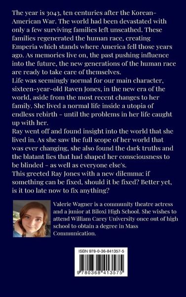 The year is 3043, ten centuries after the Korean-American War. The world had been devastated with only a few surviving families left unscathed. These families regenerated the human race, creating Emperia which stands where America fell those years ago. As memories live on, the past pushing influence into the future, the new generations of the human race are ready to take care of themselves. Life was seemingly normal for our main character, sixteen-year-old Raven Jones, in the new era of the world, aside from the most recent changes to her family. She lived a normal life inside a utopia of endless rebirth - until the problems in her life caught up with her. Ray went off and found insight into the world that she lived in. As she saw the full scope of her world that was ever changing, she also found the dark truths and the blatant lies that had shaped her consciousness to be blinded - as well as everyone else's. This greeted Ray Jones with a new dilemma: if something can be fixed, should it be fixed? Better yet, is it too late now to fix anything?